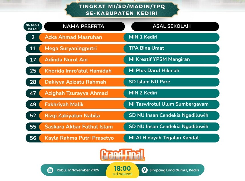 Grand Final PILDACIL Hari Santri 2025 akan berlangsung pada Rabu, 12 November 2025 pukul 18.00 WIB hingga selesai, bertempat di Simpang Lima Gumul, Kabupaten Kediri.